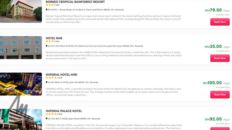 My checks on the prices of a nights stay reveal that they start from RM35 up to RM222.50 with properties available in most divisions except Serian, Samarahan, Mukah, Betong, Sarikei and Kapit.