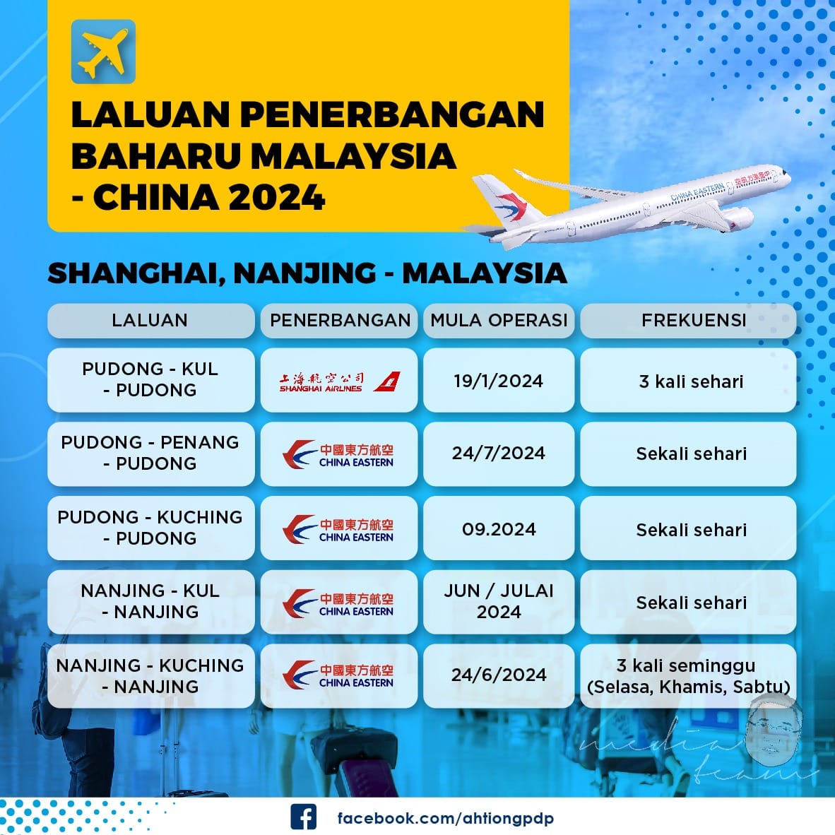 Chinese airline, China Eastern Airlines will introduce flights from Nanjing and Shanghai in China, to Kuching from June 2024.
