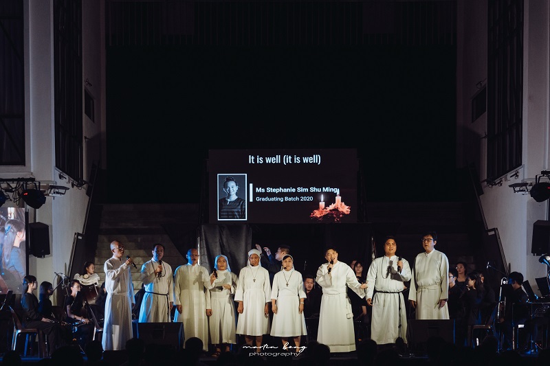 In memory of two teachers and a student who had passed on in recent years, Jesuits Fr Stanley Goh, Fr Alvin Ng, Fr Joseph Ng and Br. Aaron Lee, Marist Br. Robert Teoh, Br. Emil Alada, Franciscan Sr. Celine Wee, Sr. Irmina Peter and Sr. Cecilia Norma presented a hymn ‘It is Well with My Soul’, as they led the audience in prayer.