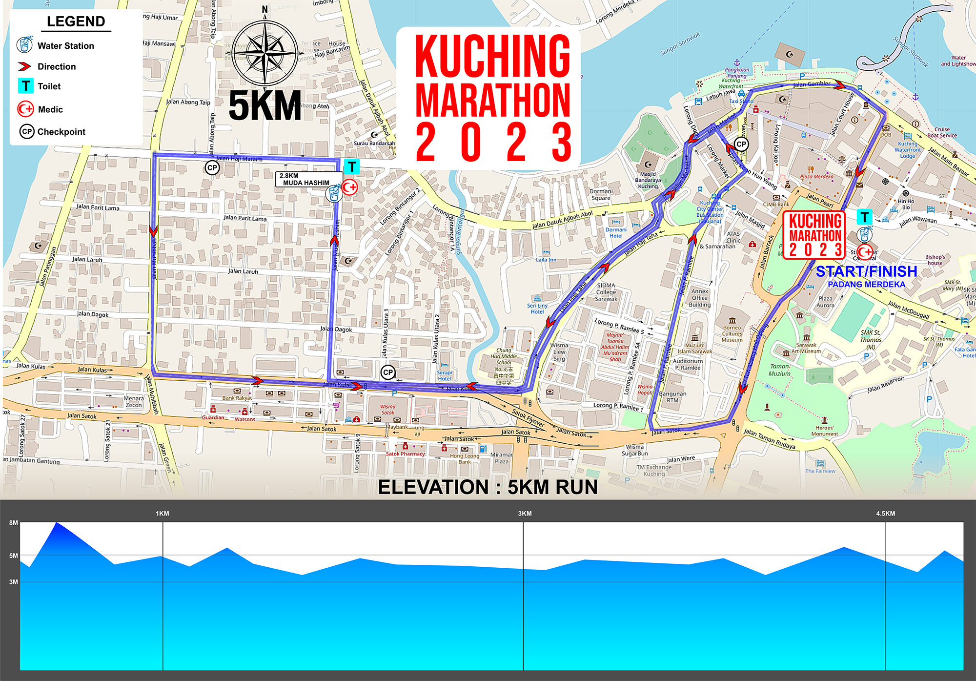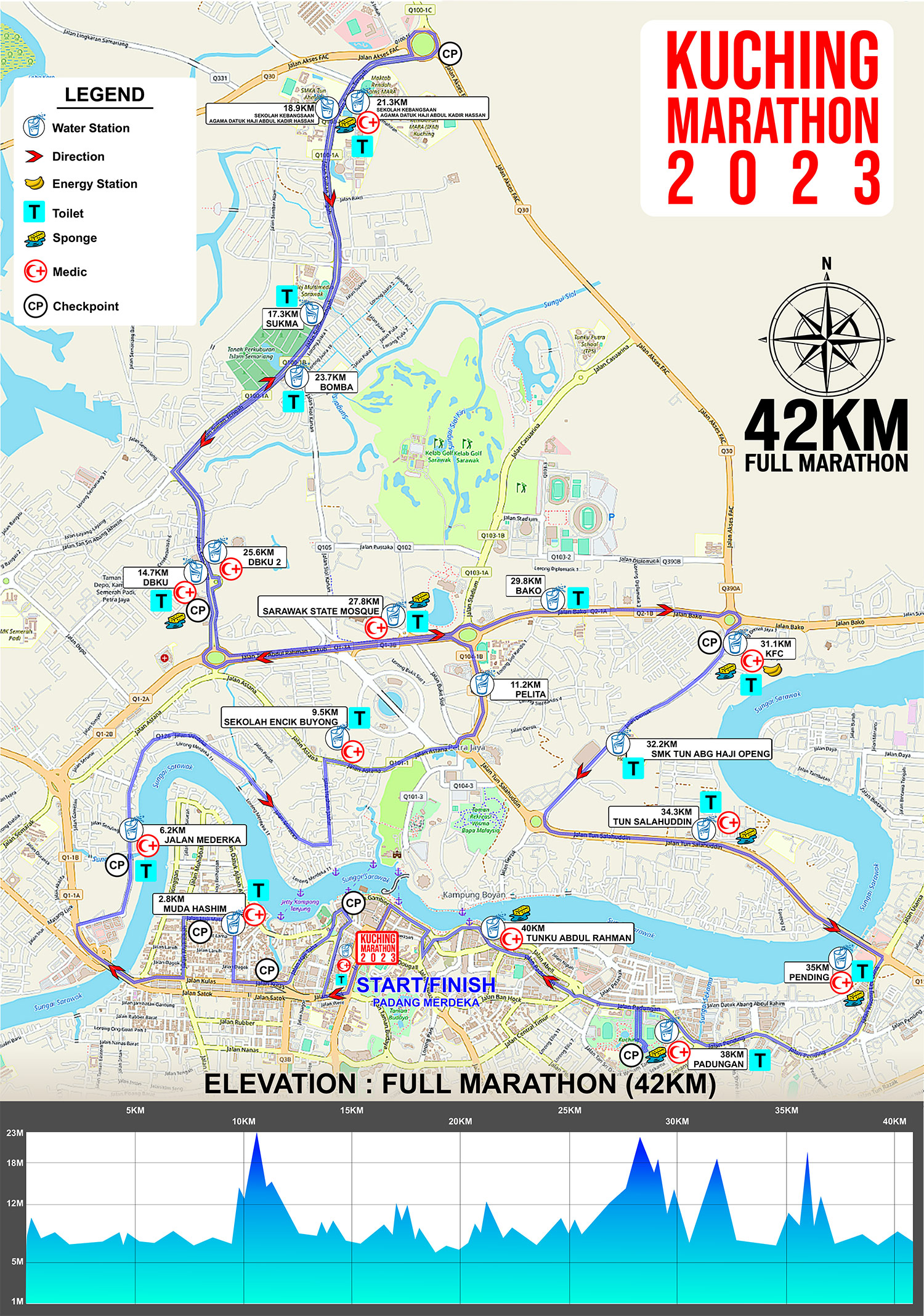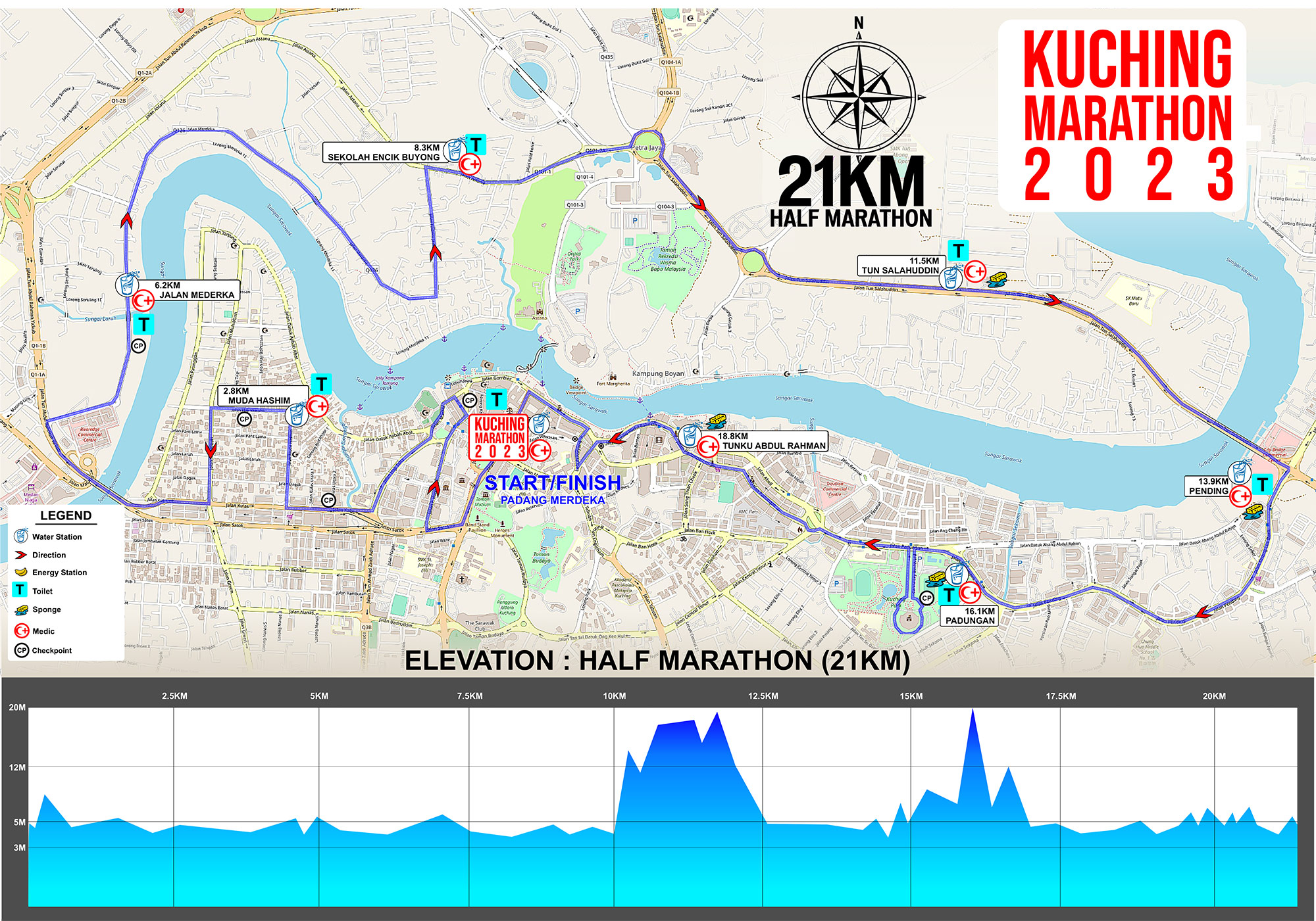 The 21KM running route for Kuching Marathon 2023 goes through several villages, the Satok Suspension Bridge, the old State Legislative Building, the Sarawak Court House, the Darul Hana Mosque and Islamic Park, Kuching Park, MBKS Headquarters, Padungan road and the Kuching Waterfront.