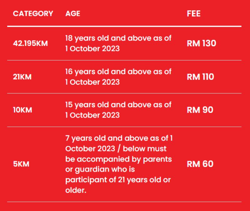 Fees to participate in each category differ with the 42KM charged at RM130, the 21KM charged at RM110, the 10KM priced at RM90 and the 5KM charged at RM60.