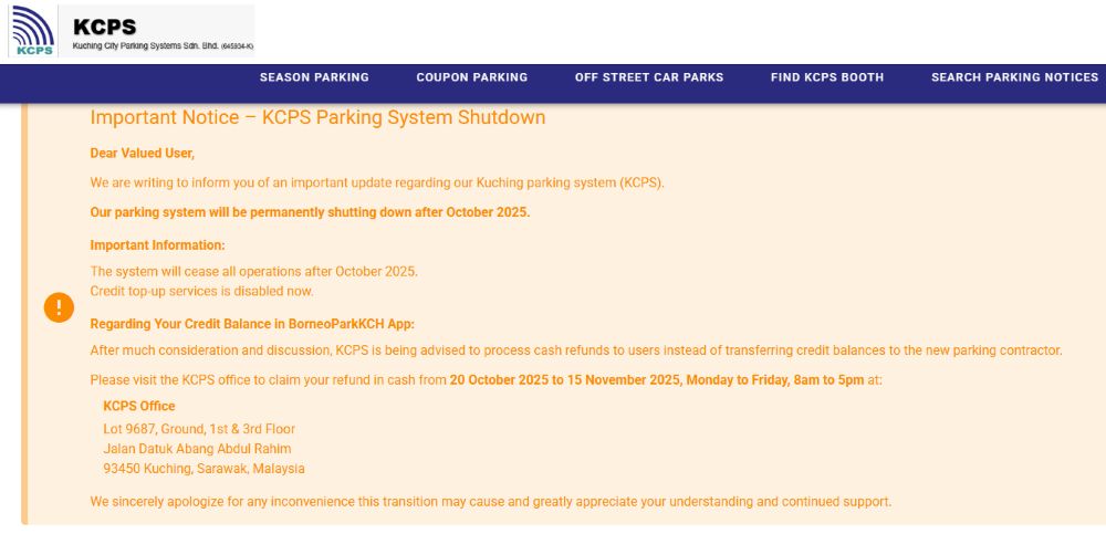 According to the company’s statement on its website, a new vendor will take over Kuching’s parking management with KCPS stating that they will permanently shut down their parking system after October 2025.