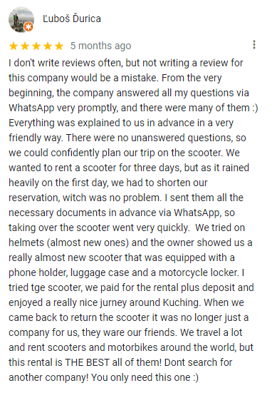 The next step is to find a reliable and honest motorcycle and scooter rental provider in Kuching.