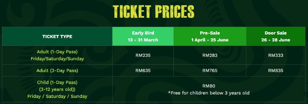 An adult one-day pass is priced at RM235, while a full three-day pass, perfect for those who do not want to miss a single beat, costs RM635.