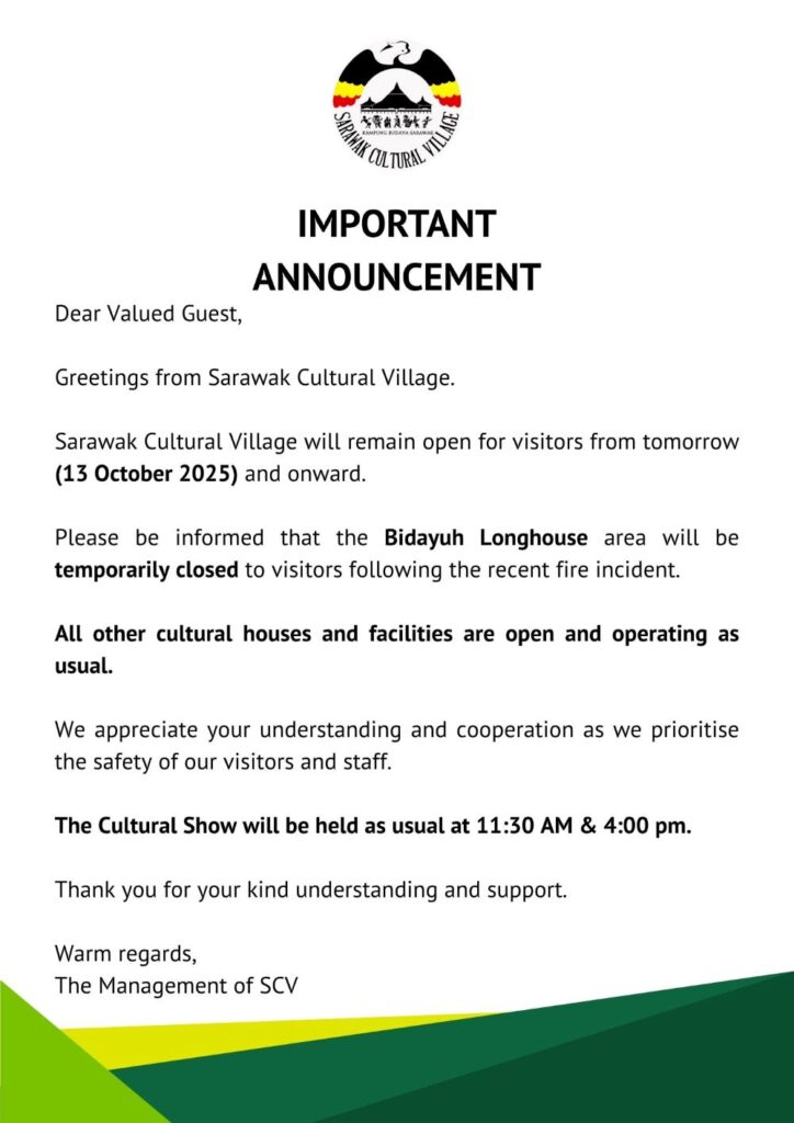 In the wake of the incident, the Sarawak Cultural Village has announced that the facility remains open to visitors, ensuring minimal disruption to tourism and its educational programs.