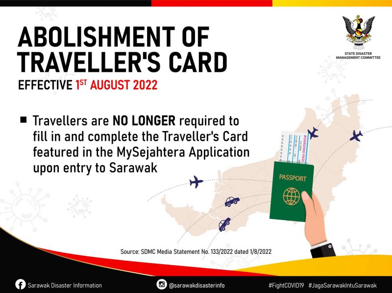 The Sarawak Disaster Management Committee (SDMC) in a statement yesterday announced that travellers entering Sarawak will no longer need to fill in the traveller’s card feature in the MySejahtera app.