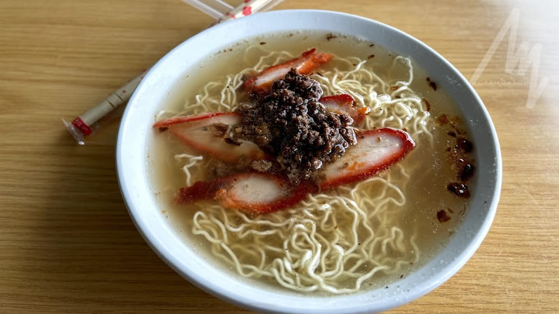 - About: The soup version of Kolo Mee. It’s served with slices of red pork meat which makes it non-halal. Also comes with sliced chillies which is dipped in vinegar. Some like to mix the chillies and vinegar in the soup. Others don’t. The one in the photo above is non-halal. In Muslim eateries, Mee soup usually uses yellow mee instead, which changes the flavour entirely.